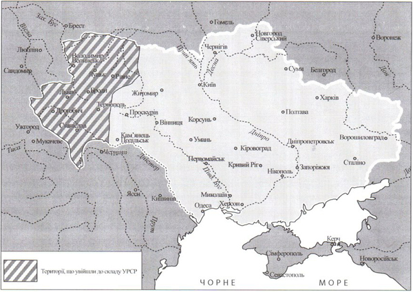 У якому році до складу УРСР увійшли території, заштриховані на картосхемі?