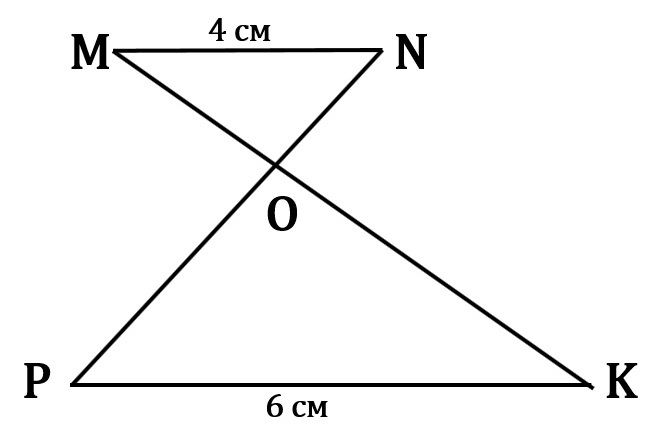 На рисунку прямі MN ǁ PK. Відрізки РN і KM перетинаються в точці О, при цьому MN = 4 см, PK = 6 см. Знайдіть відношення NO : OP.