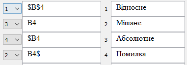 Вкажіть на правильну відповідність між посиланнями на клітинки електронної таблиці та типами посилань
