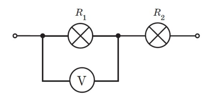 Розв’яжіть задачу. Ділянка кола (див. рисунок) містить дві послідовно з’єднані електричні лампи, опір яких становить R1=250 Ом; R2=150 Ом. Яким є показ вольтметра, якщо загальна напруга на ділянці дорівнює 160 В?