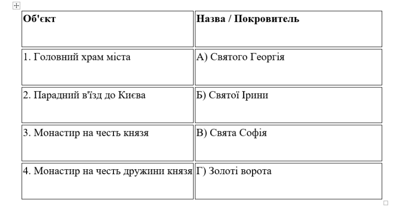 Установіть відповідність між архітектурною спорудою та її назвою/призначенням за часів Ярослава: