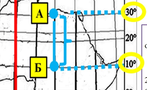Визначити відстань в градусах між точками А і Б