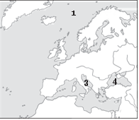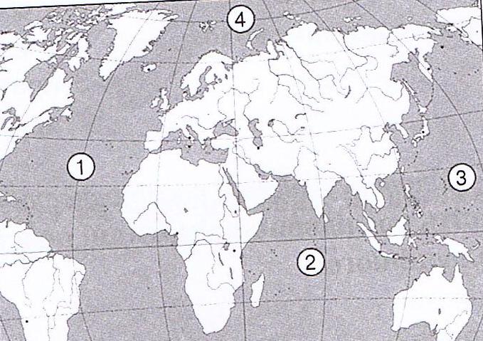 Вкажіть, якою цифрою на картосхемі позначено Атлантичний океан