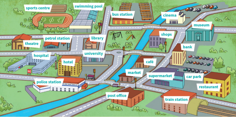 The hospital is _______ the petrol station.