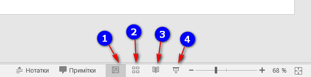 На малюнку зображено скриншот нижнього правого кута редактора презентацій PowerPoint. Якою цифрою позначено Режим показу слайдів?