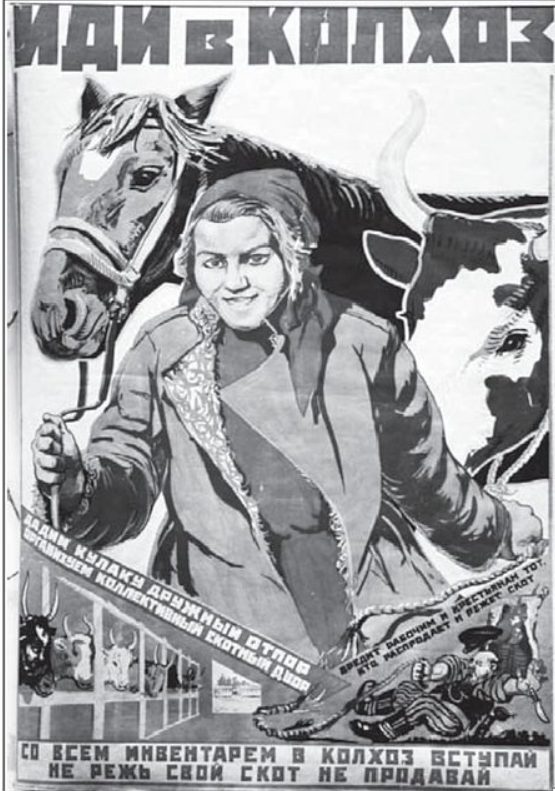1) об'єднання селянських господарств у великі підприємства шляхом примусового усуспільнення землі, реманенту, худоби