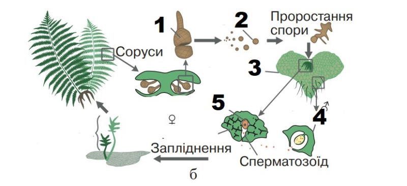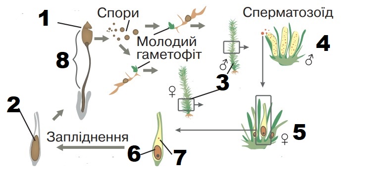 Який складник на схемі життєвого циклу мохів позначено буквою Х?