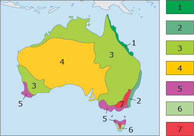 Встановіть відповідність між природною зоною Австралії та цифрою, якою вона позначена на карті.