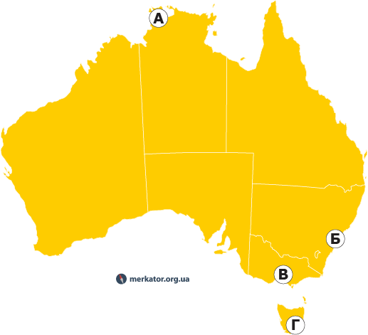 Встановіть відповідність між регіоном Австралійського Союзу та буквою, якою він позначений на карті.
