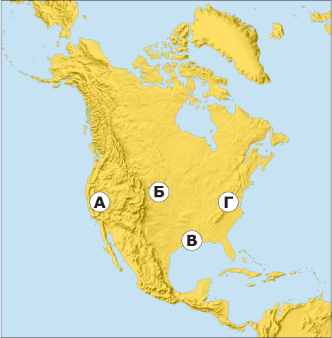 Встановіть відповідність між елементами рельєфу Північної Америки, які позначені на карті буквами та їх назвами.