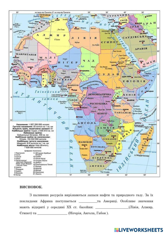 Висновки. Доповніть речення: "Особливе значення мають відкриті у середині ХХ ст. нафто -газові басейни:________________ (Лівія, Алжир, Єгипет) та _____________________ (Нігер, Ангола, Габон)"