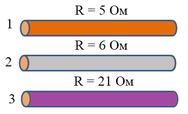 Три провідники виготовлені з різного матеріалу: нікеліну, олова, заліза та мають однакову площу поперечного перерізу. Користуючись таблицею 7 на стор. 231, вкажіть правильний порядок провідників на малюнку