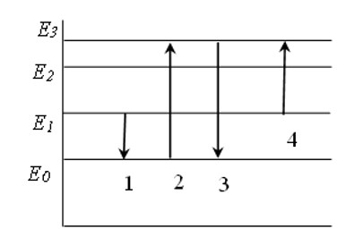 На рисунку зображено діаграму енергетичних рівнів атома. Стрілкою з якою цифрою позначено перехід з випромінюванням фотона найбільшої частоти? Укажіть правильну відповідь.