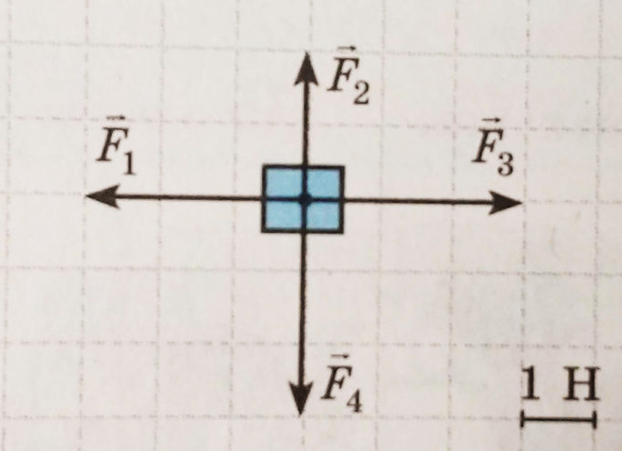 На малюнку зображено тіло та сили, що на нього діють (одна клітинка - 1Н). Знайдіть значення рівнодійної сили.
