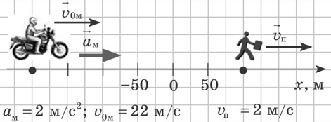 Використовуючи дані рисунка, визначте через який час і де зустрінуться мотоцикліст та пішохід. (3 бали)