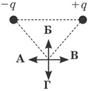 Яким є напрямок напруженості електричного поля, створеного двома однаковими за модулем точковими зарядами (див. рисунок)? (1 бал)