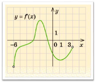 Функція у = f(х) визначена на проміжку ( -6; 3). На рисунку зображено графік її похідної. Вкажіть проміжки спадання функції.