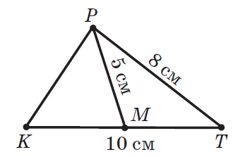 У трикутнику PKT сторони KT і PT дорівнюють 10 см та 8 см відповідно, довжина медіани PM — 5 см. Знайди периметр трикутника PMT .