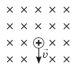 Заряджена частка рухається у однорідному магнітному полі так, як показано на малюнку. Лінії магнітної індукції спрямовані від спостерігача. Куди спрямовано силу, що діє на заряджену частинку?