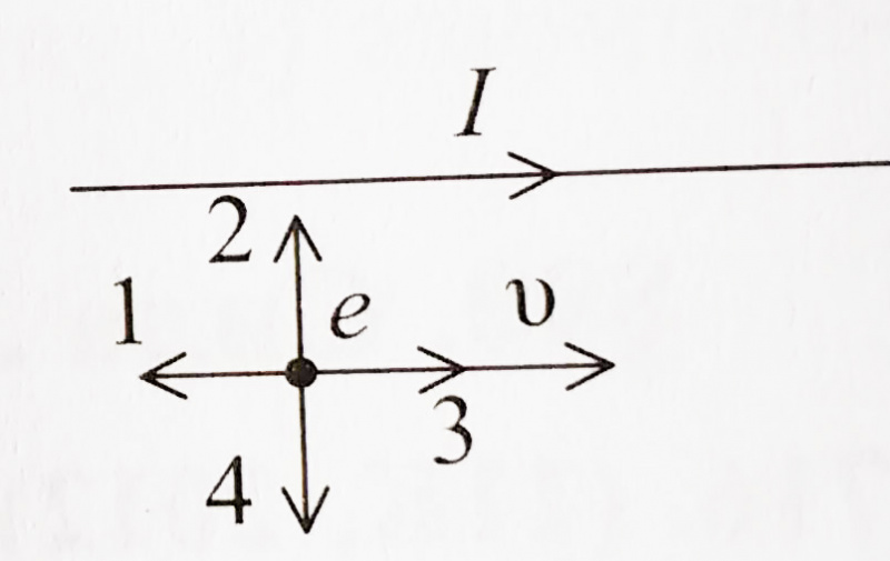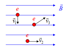 У однорідне магнітне поле поміщено три електрони, що рухаються так, як показано на малюнку. На який із електронів не діє сила з боку магнітного поля (сила Лоренца)?