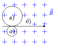 Протон влітає в однорідне магнітне поле зі швидкістю v так, як показано малюнку а). На якому малюнку б) правильно зображено траєкторію руху частки?