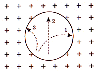 Три частинки влетіли в однорідне магнітне поле. На малюнку траєкторії їхнього руху показані штриховою лінією. Лінії магнітної індукції спрямовані від спостерігача. Яка частина має негативний заряд?