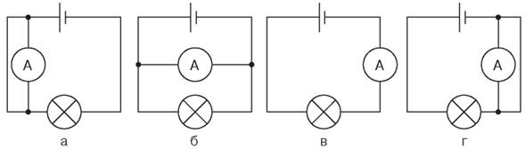 На якому малюнку амперметр підключено правильно.