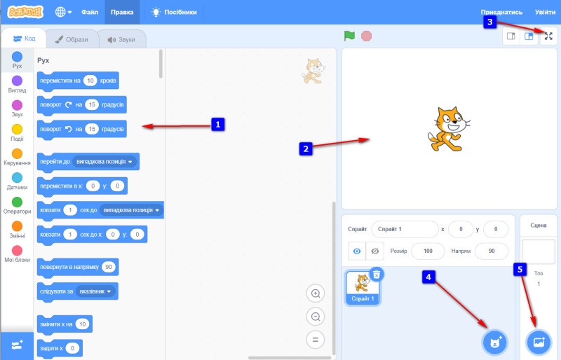 На малюнку зображено інтерфейс середовища програмування Скретч. Якою цифрою позначено блоки команд?