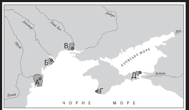 Встановіть відповідність розташування міст – держав Північного Причорономор'я на карті