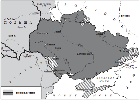 Якою цифрою на картосхемі позначено територію УСРР, утрачену республікою в 1920-ті рр.?