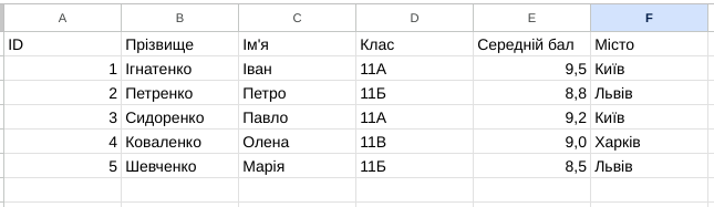 Який SQL-запит виведе прізвища та імена учнів з міста Київ?