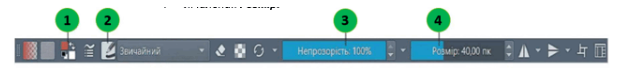 На Панелі "Пензлі" цифрою 1 позначено інструмент