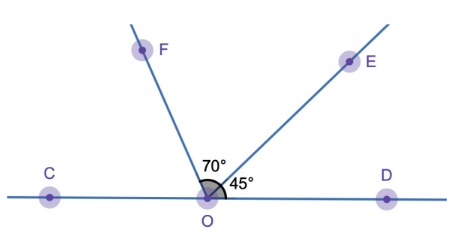 Із точки O, яка лежить на прямій CD, проведено промені OE і OF (див. рисунок). Відомо, що ∠DOE=45°, ∠EOF=70°. Визначте градусну міру кута ∠COE. Уважайте, що промені OE, OF і пряма CD лежать в одній площині.