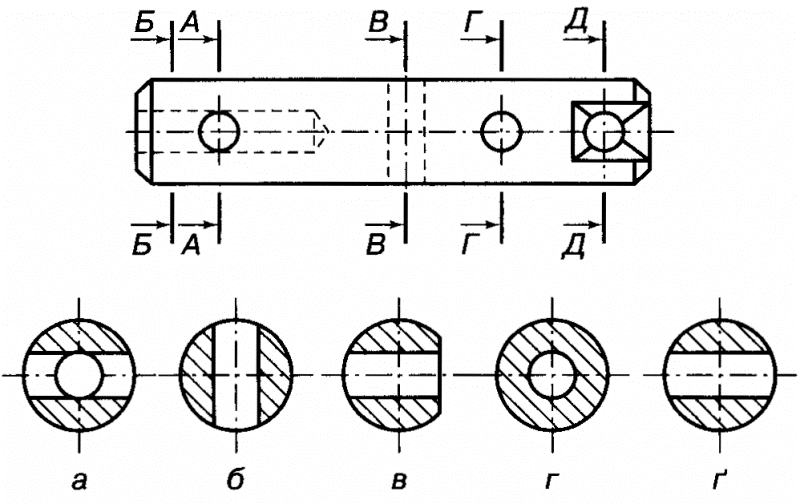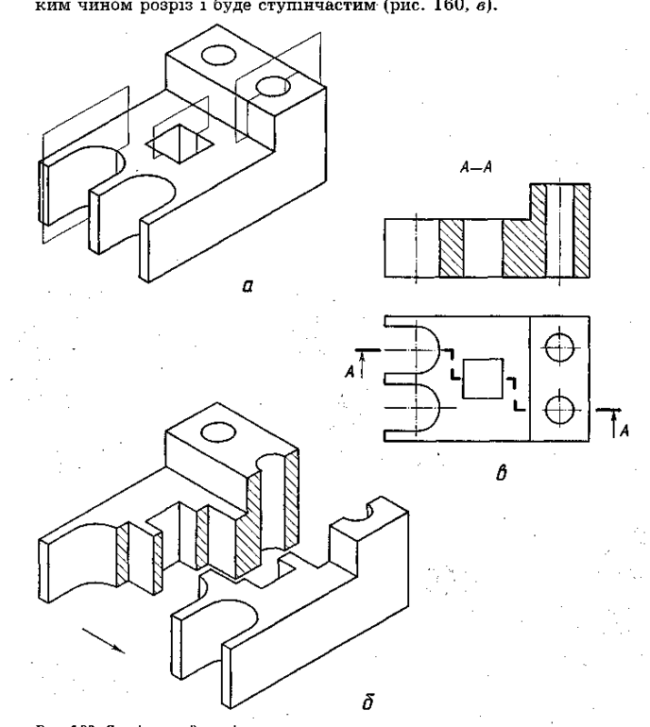 Подивіться на предмет, зображений на рисунку. Він має отвори, які розташовано так, що їх неможливо показати на кресленні, застосувавши одну січну площину. Тому предмет умовно розрізано трьома паралельними січними площинами, кожна з яких виявляє форму окремого отвору. У площині креслення всі три січні площини суміщені в одну. Утворений таким чином розріз і буде ступінчатим.
