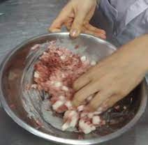 Для приготування якого н/ф м'ясо пропускають через м'ясорубку з решіткою, яка має малі отвори, додають посічену, злегка пасеровану ріпчасту цибулю, сирі яйця, мелений перець, сіль, воду, все добре перемішують, порціонують і формують кульки масою 7-10 г, припускають
