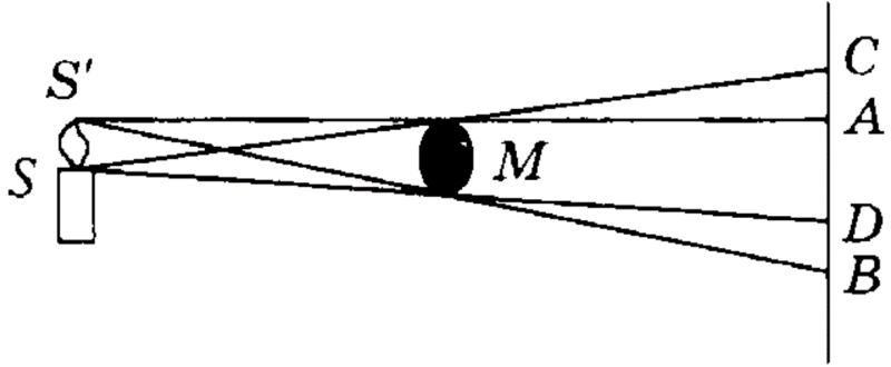 На рисунку зображено протяжне джерело світла SS' та екран, між якими знаходиться непрозоре тіло М. Якими буквами позначені межі тіні і півтіні цього тіла на екрані?