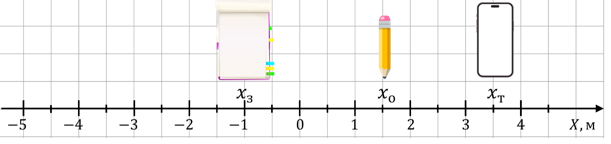 За допомогою координатної осі ОХ покажіть положення тіл, якщо їх розташування задане такими числами: телефон – (3,5 м), олівець – (1,5 м), зошит – (–1 м). Знайдіть відстань між телефоном і зошитом.