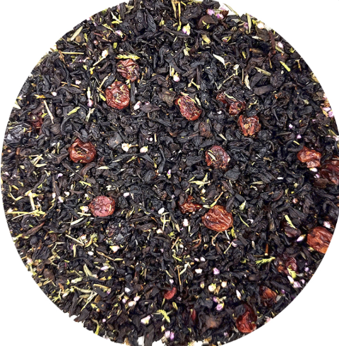 Чай цейлонський чорний ОР (крупнолистий), пелюстки волошки, листя чорної смородини, ароматизатор ідентичний натуральному “Суниця”.