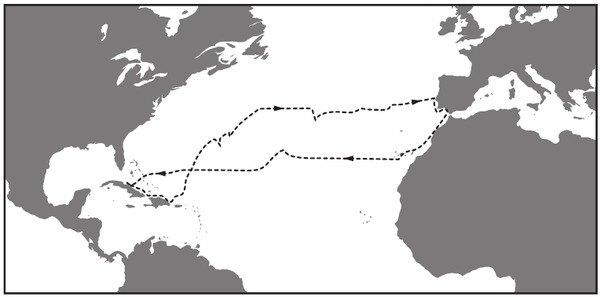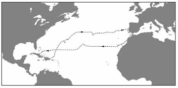 На якій картосхемі позначено шлях першої експедиції Христофора Колумба?