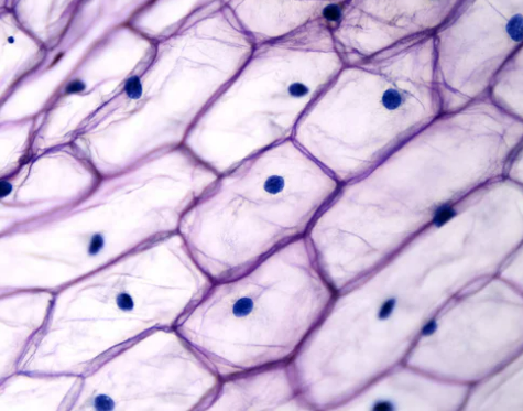 Розляньте фотографію шкірочки цибулі. Які частини клітини можна побачити у світловий мікроскоп