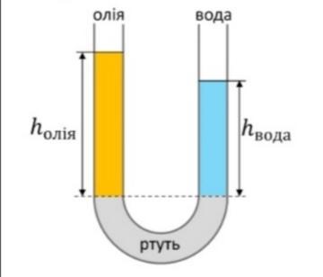 Нижню частину сполучених посудин наповнили ртуттю. У ліве коліно налили олію (густина 900 кг/м³), а в праве – воду (густина 1000 кг/м³), при цьому висота стовпчика води дорівнює 9 см. Якої висоти має бути стовпчик олії, щоб рівень ртуті в посудинах не змінився?