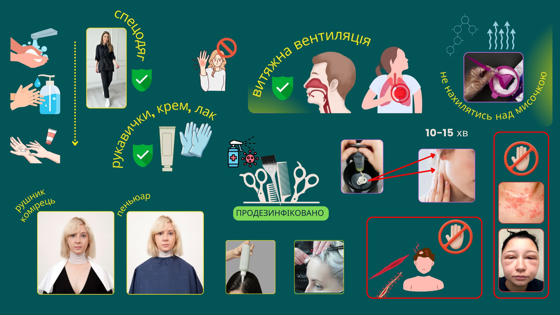 Приклад запитання: Якою є правильна послідовність гігієнічної обробки рук перукаря перед початком фарбування?