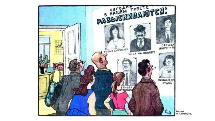 Напис на карикатурі: «Сьогодні в нашому тресті розшукуються: “пішла в хімчистку”; “пішов на об'єкт; “відійшов покурити”; “пішла в другий відділ”».