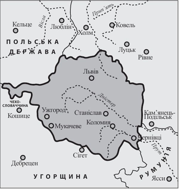 Українські землі, окреслені на картосхемі жирною лінією, увійшли до складу УНР в результаті