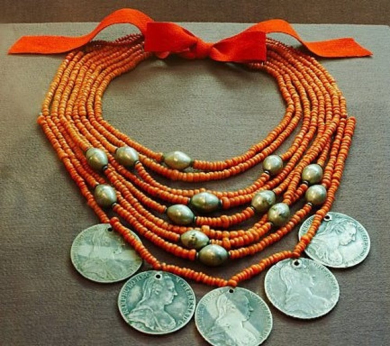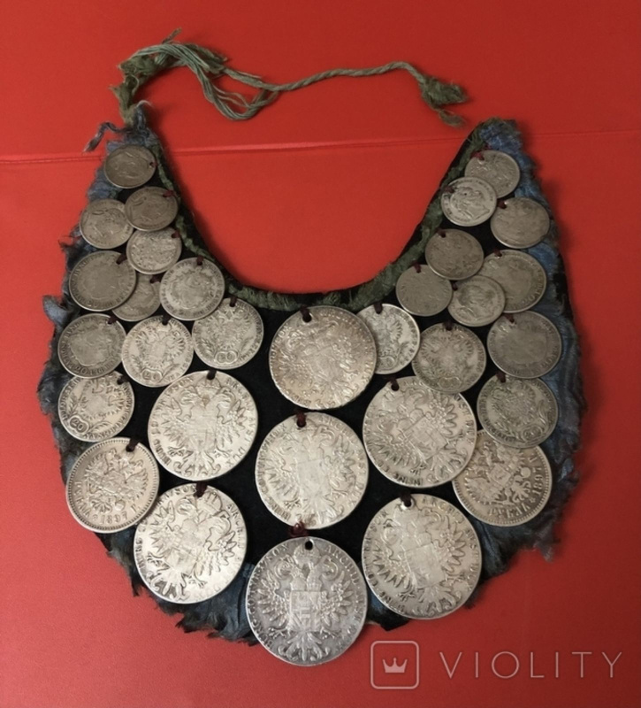Масивне намисто з тканини розшитої монетами. Такі прикраси притаманні Буковині.Це