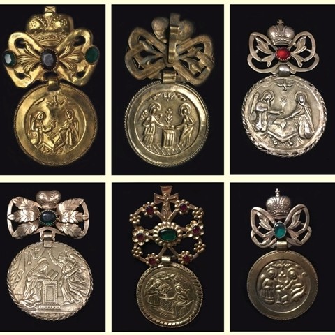Українська прикраса у вигляді великої медалеподібної монети з металевим бантом, прикрашеним камінцями.Це