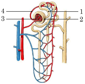 Розгляньте зображення нефрона, на якому складники позначено цифрами 1-4.