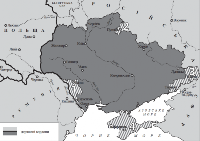 Якими цифроми на карті показано території, що були виключені зі складу УСРР в 1920-х роках та включені до складу РФСРР?