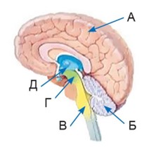 Установіть відповідність між функціями відділів головного мозку (1–4) та відділами (А–Д), зображеними на малюнку.