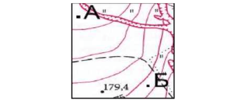 За фрагментом топографічної карти визначте азимут з точки А у точку Б